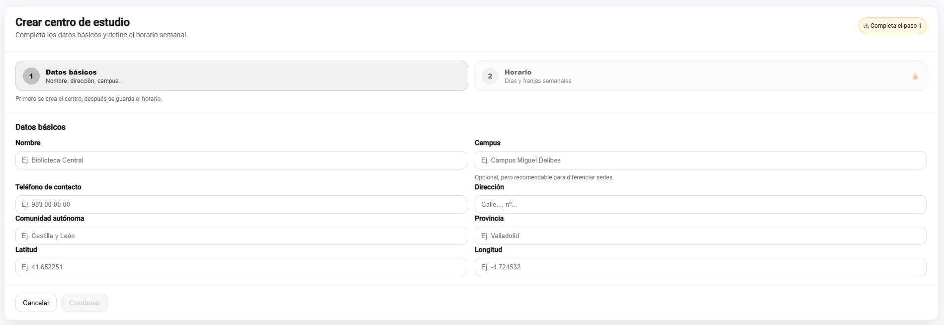 - Básicos: nombre, campus, teléfono, dirección, comunidad, provincia, latitud, longitud