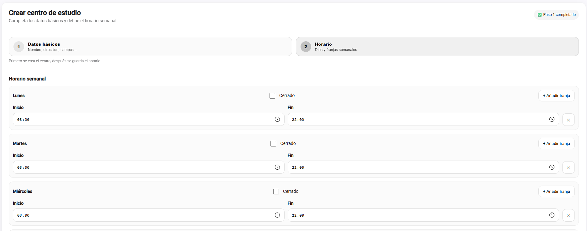 - Horario: por días, y franjas cada día. opción de abierto/cerrado